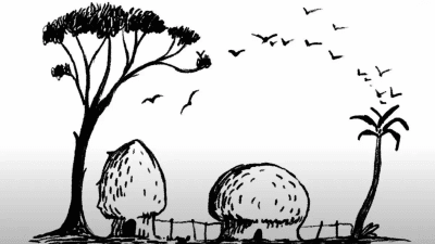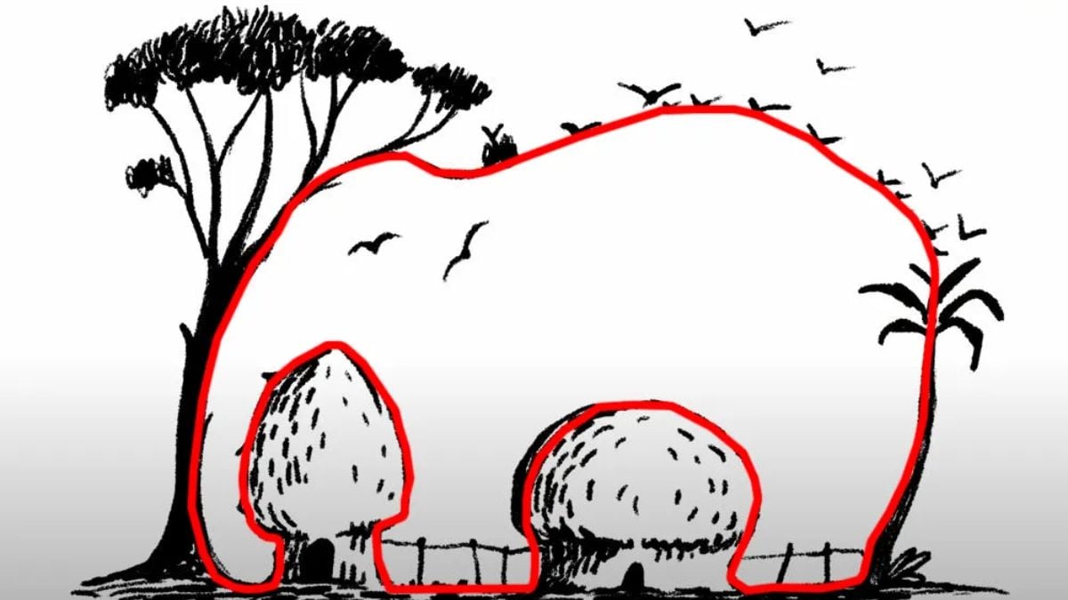Die Zeichnung zeigt Bäume, Gras und Felsen – alles sieht ganz gewöhnlich aus, bis man genau hinsieht. Die Umrisse des Elefanten sind geschickt in den Details versteckt: Schatten, Rüssel und die Kurven der Äste. Deshalb fällt er den meisten Menschen nicht sofort auf.