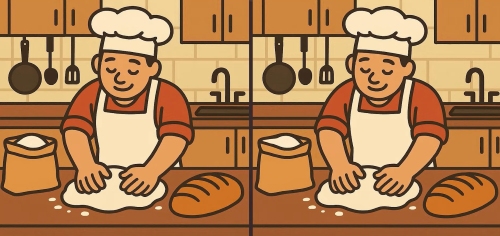 Sind Sie bereit für die nächste Herausforderung, die Ihre Beobachtungsgabe und Aufmerksamkeit testen wird? Schauen Sie sich zwei Bilder eines Kochs an, der Teig knetet. Auf den ersten Blick sehen die Bilder identisch aus, aber bei genauerem Hinsehen werden Sie 3 versteckte Unterschiede entdecken. Kannst du diese Unterschiede in 23 Sekunden finden? Starten Sie den Timer und testen Sie Ihre Sehschärfe.