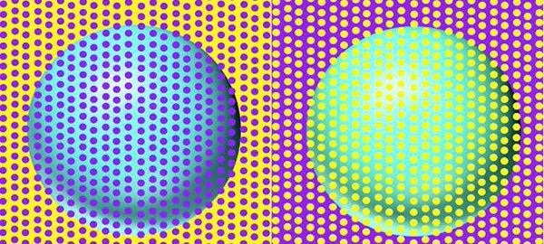 Die Kugeln erscheinen unterschiedlich, weil die linke Kugel von violetten Punkten auf gelbem Hintergrund umgeben ist und die rechte Kugel von gelben Punkten auf violettem Hintergrund umgeben ist.