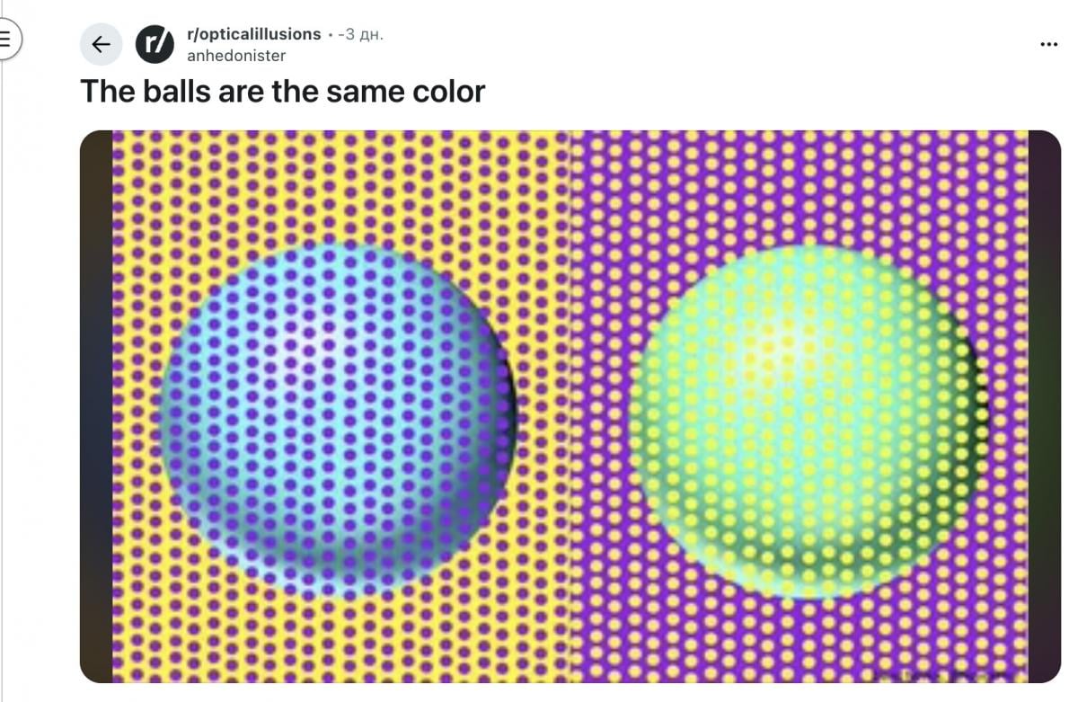 Das Bild ist vertikal in zwei Hälften geteilt: Die linke Hälfte zeigt einen blauen Ball auf gelbem Hintergrund, der mit einem Muster aus lila Punkten bedeckt ist. Die rechte Hälfte zeigt einen grünen Luftballon auf lila Hintergrund mit einem Muster aus gelben Punkten. Der Titel des Beitrags behauptet, dass die Bälle tatsächlich die gleiche Farbe haben.