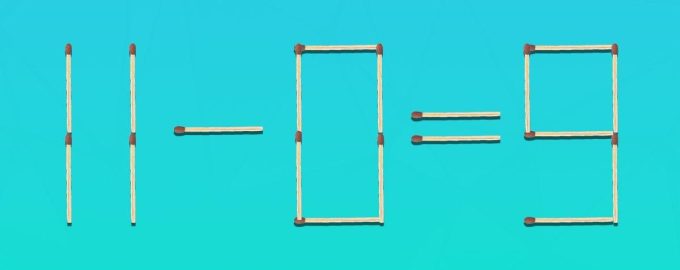 Sie haben also eine falsche Gleichheit vor sich: 11 – 0 = 9. Sie besteht aus 19 Streichhölzern. Wenn Sie eines davon verschieben, wird die Gleichheit richtig. Die Aufgabe kann erschwert werden, indem man ihre Erfüllung auf eine bestimmte Zeit begrenzt, zum Beispiel 15 Sekunden.