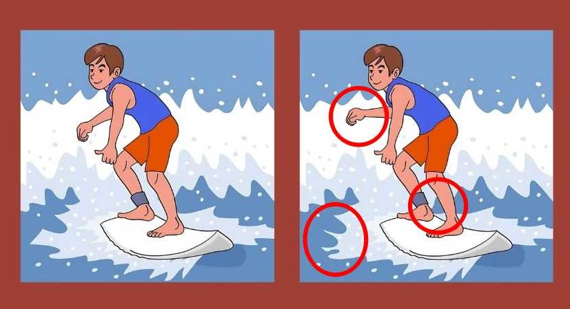 Auf dem Bild sehen wir einen Surfer, der auf einem Surfbrett die Wellen bezwingt. Auf den ersten Blick sieht es so aus, als ob die Typen auf beiden Bildern gleich sind, aber wenn man genau hinsieht, wird klar, dass das nicht stimmt – irgendwo gibt es ein paar Unterschiede, die die Bilder voneinander unterscheiden.