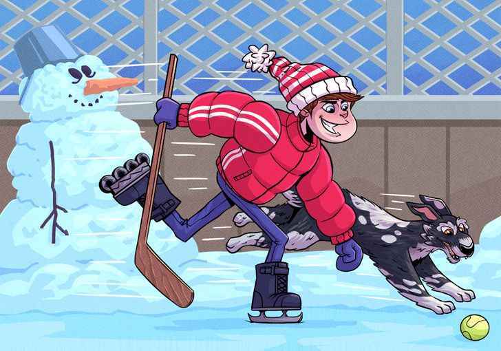 Auf dem Bild sehen wir einen Jungen, der auf dem Eis Schlittschuh läuft, und einen Hund, der neben dem Jungen herläuft. Auf den ersten Blick mag es so aussehen, als gäbe es keinen Fehler in dem Bild, aber das ist nicht der Fall. Wenn Sie genau hinschauen, werden Sie feststellen, dass einige Dinge falsch gezeichnet wurden.