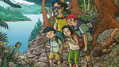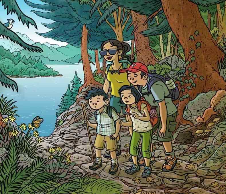 Das Bild zeigt eine Frau und ihre Kinder in der Natur. Es sieht so aus, als würden sie Fotos machen. Es gibt auch eine Schlange, die sich irgendwo in der Nähe versteckt und die es zu finden gilt.