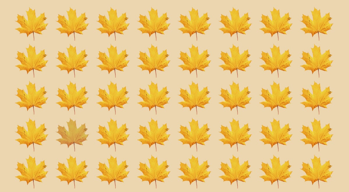 Wir sehen auf dem Bild viele herbstlich vergilbte Blätter, die in Reihen und Spalten angeordnet sind. Auf den ersten Blick sehen sie alle gleich aus. Du solltest deinen Augen aber nicht sofort trauen, denn wenn du das Bild genauer und sorgfältig betrachtest, wirst du feststellen, dass ein Blatt nicht mit allen anderen übereinstimmt.