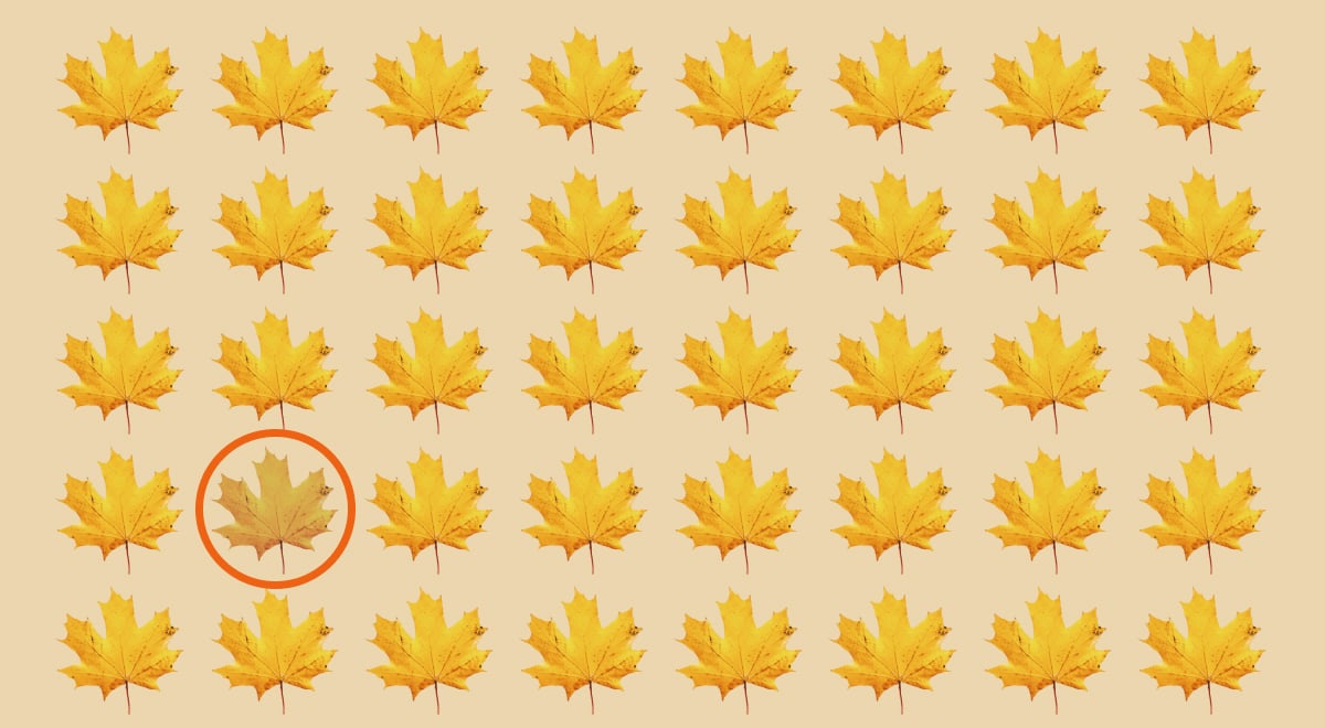 Die nächste Aufgabe besteht darin, unter einer großen Anzahl von gelben Blättern nur eines zu finden, das sich von allen anderen unterscheidet.