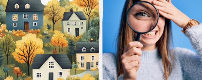 Unten sehen Sie ein Bild einer Wohngegend mit gemütlichen Häusern und bunten Bäumen. Ihre Aufgabe ist es, inmitten dieser Schönheit Störche zu finden.