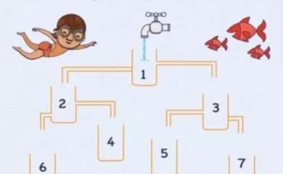Die Abbildung zeigt sieben Krüge, die durch Rohre verbunden sind. Das Wasser kommt aus dem Hahn Nummer 1 und fließt durch ein System von Abzweigungen. Auf den ersten Blick scheint die Antwort offensichtlich zu sein, aber die Schwierigkeit besteht darin, dass einige der Rohre verschlossen sind, so dass das Wasser nicht fließen kann.