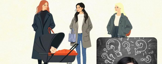 Unten sehen Sie ein Bild, das drei Freunde zeigt, die sich in einem Park getroffen haben. Eine von ihnen ist die Mutter eines Babys, das leise in einem Kinderwagen eingeschlafen ist.