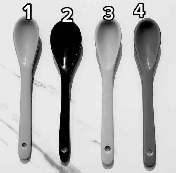 Auf dem Bild sehen wir vier Löffel, die zweifellos unterschiedliche Farben haben. Aber die Sättigung wurde aus dem Bild entfernt, so dass es schwierig ist, sofort zu erkennen, welche Farbe die einzelnen Objekte haben.