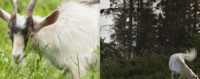 Eine Ziege versteckte sich im Grünen / Collage mit Moje-Foto