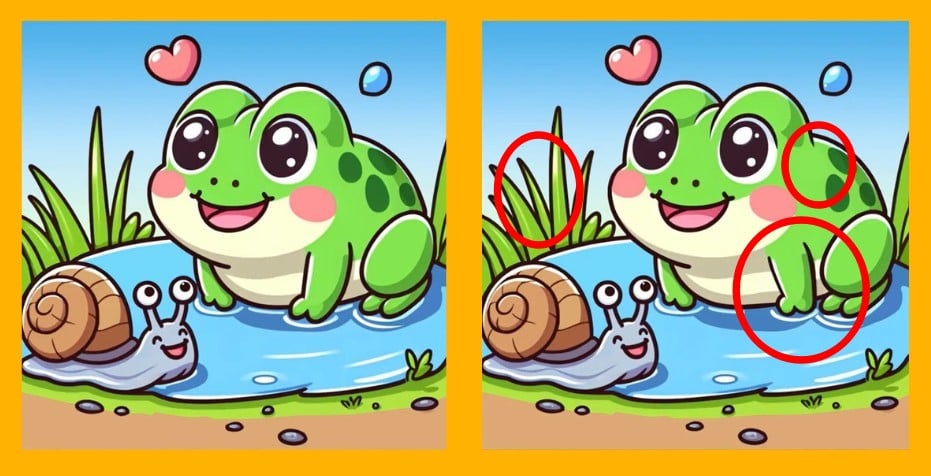 Sind Sie also bereit für die nächste Herausforderung? Sieh dir zwei Bilder von einem Frosch und einer Schnecke genau an. Auf den ersten Blick mögen sie gleich aussehen, aber es gibt 3 kleine Unterschiede. Glaubst du, dass du sie alle in 17 Sekunden finden kannst? Probiere es aus und teste deine Sehschärfe!