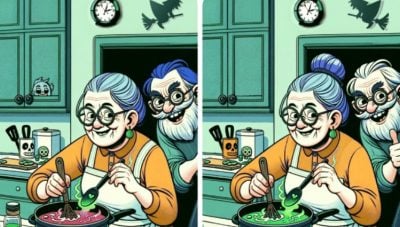 Auf dem Bild sehen wir eine Großmutter, die Essen kocht, und einen Großvater. Sie lächeln beide und zeigen ihre optimistische Stimmung. Die Küche strahlt eine Atmosphäre der Harmonie und Gemütlichkeit aus, die von dem älteren Paar geschaffen wird.