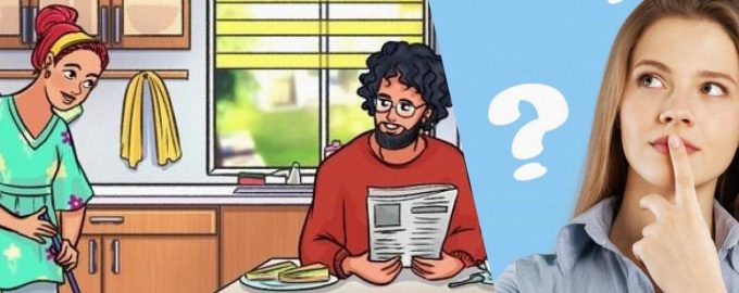 Das Bild zeigt ein Paar, das seinen Tag in der Küche genießt. Der Mann liest die Zeitung und trinkt Tee, während die Frau den Boden wischt. Sie werden gebeten, einen in diesem Bild versteckten Fehler zu erkennen. Sie müssen sich das Bild genau ansehen, bevor Sie die Frage „Was stimmt nicht mit dem Bild?“ beantworten können. Um das Spiel noch interessanter zu machen, versuchen Sie, die Antwort in einer begrenzten Zeit von 11 Sekunden zu finden.