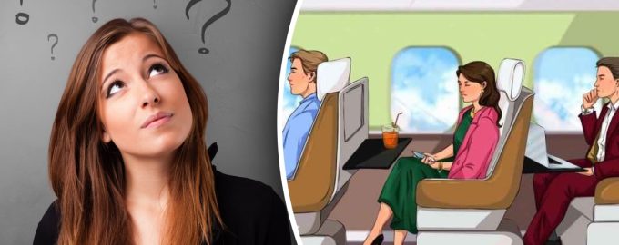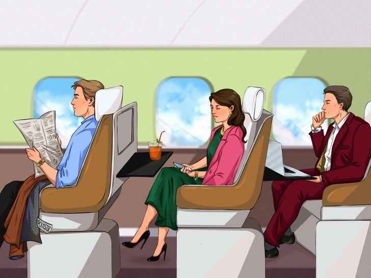 Auf dem Bild sehen wir drei Personen, die auf ihren Plätzen in einem Flugzeug sitzen – zwei Männer und eine Frau. Auf den ersten Blick wirkt keiner von ihnen verdächtig. Man muss schon genau nachdenken, um herauszufinden, wer von ihnen der Betrüger ist.