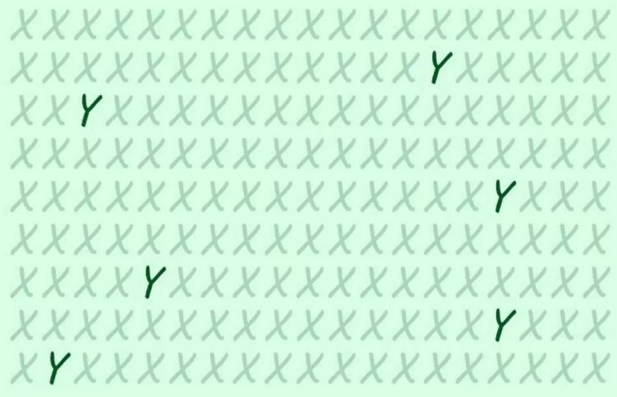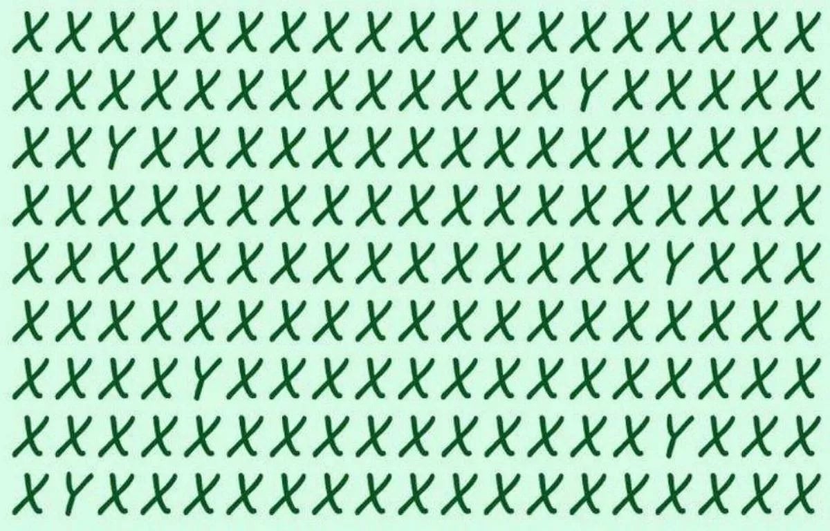 Diese Aufgabe besteht aus 9 Zeilen und 31 Spalten, die überwiegend mit dem Buchstaben X gefüllt sind. Ihre Aufgabe ist es, die sechs versteckten Ys zu finden. Um die Aufgabe zu erschweren, haben Sie nur 13 Sekunden Zeit, um die Antwort zu finden.