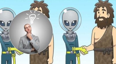Auf dem gezeigten Bild sind zwei identische Außerirdische und zwei Höhlenmenschen zu sehen.