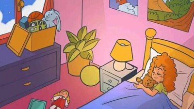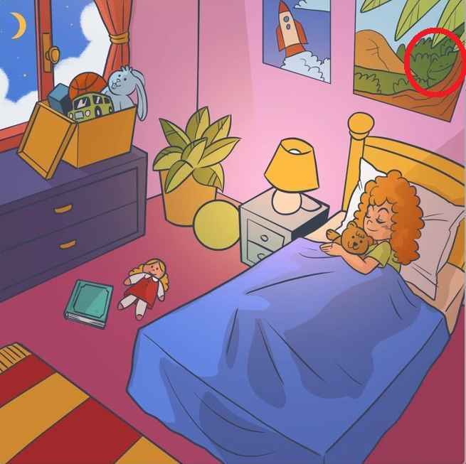 Du konntest den Frosch nicht finden? Hier ist ein Hinweis – er ist auf dem Bild über dem Bett des Mädchens.