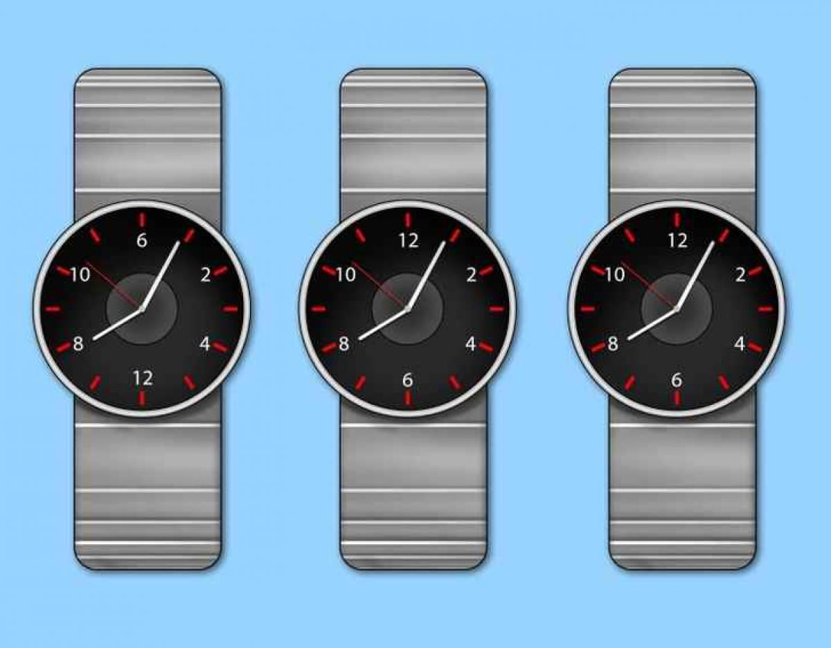 Auf dem Bild sind drei Uhren zu sehen. Sie zeigen alle die gleiche Zeit an – 8:05. Unter ihnen gibt es jedoch eine Uhr, mit der etwas nicht stimmt.