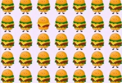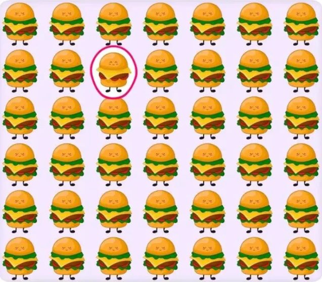 Du konntest den Cheeseburger nicht finden? Hier ist der Hinweis – es ist der dritte Burger in der zweiten Reihe von links. Im Gegensatz zu den anderen hat dieser Burger keinen Salat.