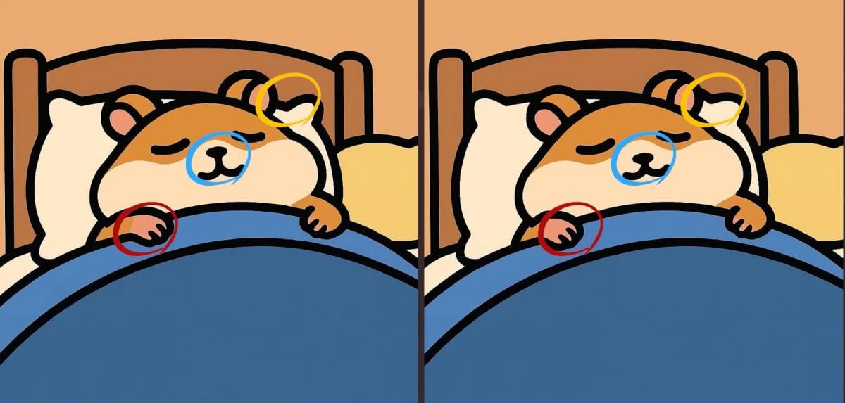 Sind Sie also bereit für die nächste Herausforderung? Schauen Sie sich die beiden Bilder eines schlafenden Hamsters genau an. Auf den ersten Blick mögen sie gleich aussehen, aber es gibt 3 kleine Unterschiede. Glaubst du, dass du sie alle in 29 Sekunden finden kannst? Probiere es aus und teste deine Sehschärfe!