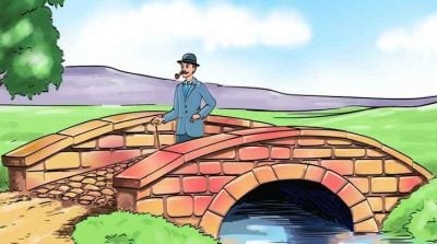 Auf dem Bild sehen wir einen Mann im Anzug, mit Hut und mit einem Stock, der über eine Brücke geht. Um ihn herum sind grüne Felder. In der Nähe wächst ein Baum und es fließt ein Fluss.