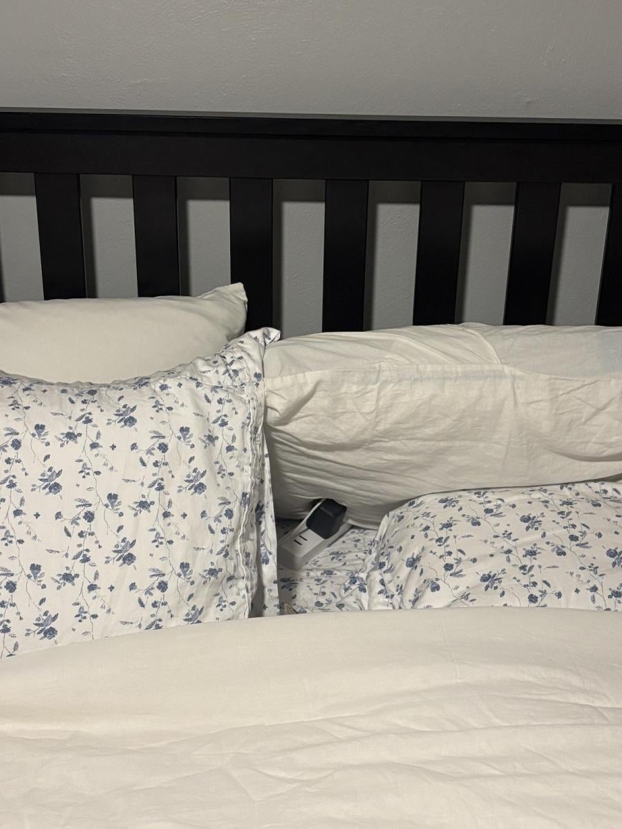 Auf dem Bild ist ein Teil des Bettes zu sehen. Auf den ersten Blick sieht es so aus, als gäbe es kein Lebewesen auf dem Bild, aber das ist nicht der Fall – irgendwo dort versteckt sich ein Kätzchen.