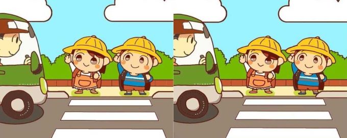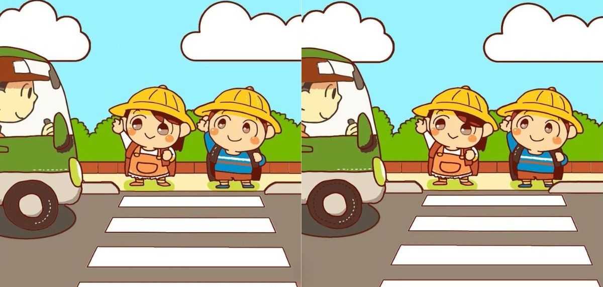 Im nächsten Rätsel müssen Sie drei Unterschiede zwischen den Bildern von zwei Schulkindern finden, die an einem Fußgängerüberweg stehen und ein vorbeifahrendes Auto betrachten.