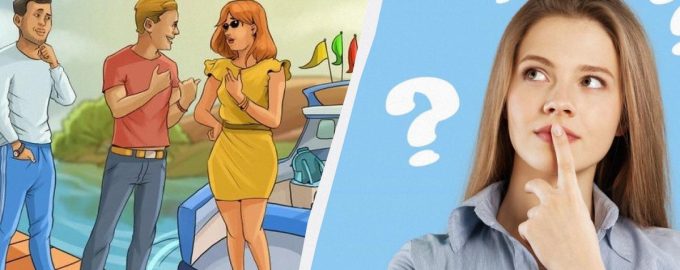 Das Rätsel zeigt zwei Männer, die vor einem Mädchen neben einer Yacht stehen, und jeder von ihnen versucht, sie davon zu überzeugen, dass er der Besitzer der Yacht ist.