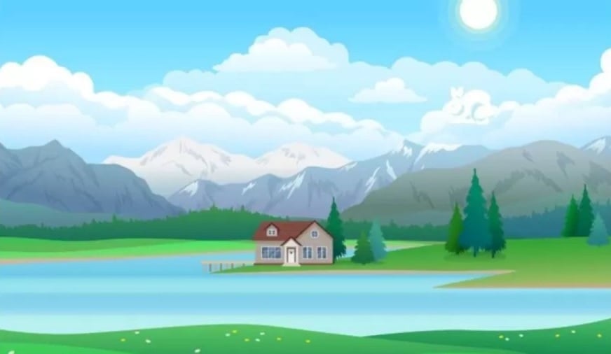 Auf dem Bild sehen wir ein Haus am See, und ein wenig weiter hinter dem Haus – die Berge. Wir sehen auch den Himmel und die Wolken, eine kleine Anzahl von Bäumen und Gras. Aber irgendwo in dieser Natur ist ein Tier versteckt – ein Kaninchen, das sehr schwer zu entdecken sein wird.
