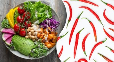 Das Foto zeigt einen vollen Teller, auf dem wir geschnittenes und ganzes Gemüse, Grünzeug und Hülsenfrüchte sehen. Doch hinter einem so reichhaltigen Teller verbirgt sich eine „Überraschung“ – irgendwo ist eine Chilischote versteckt, die fast nicht zu erkennen ist.