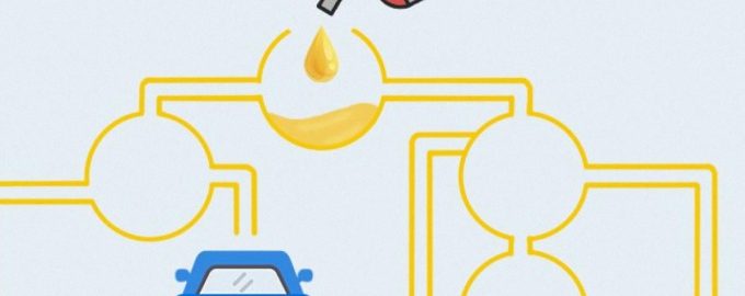 Auf dem Bild sehen Sie vier Autos, die durch ein komplexes System von Rohren und Tanks mit dem zentralen Kraftstofftank verbunden sind.