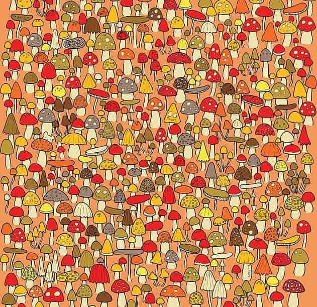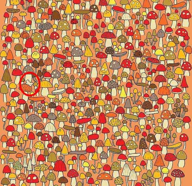 In der Abbildung unten sehen Sie viele verschiedenfarbige Pilze. Wenn Sie genau hinsehen, können Sie erkennen, dass sich eine Maus unter den Pilzen versteckt.