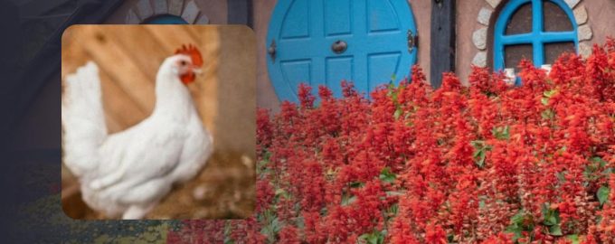 Das Huhn ist auf der linken Seite des Fotos zu sehen, es ist sehr gut zwischen den roten Blumen am Eingang der Lodge versteckt.