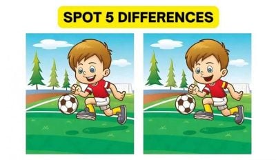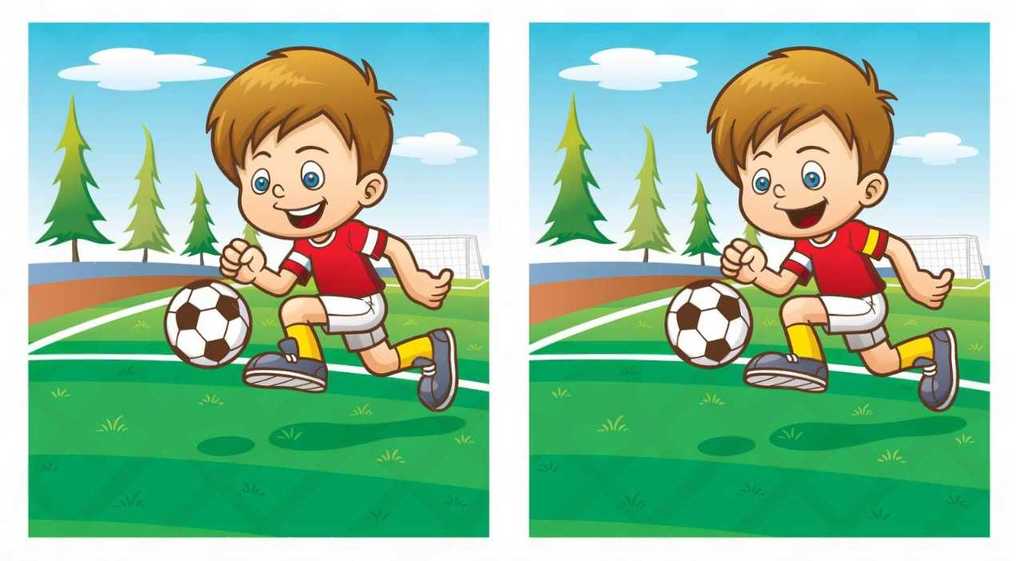 Das Bild zeigt einen Jungen, der Fußball spielt. Obwohl die beiden Bilder auf den ersten Blick gleich aussehen, sind sie es nicht. Es gibt fünf Unterschiede zwischen den beiden Bildern.