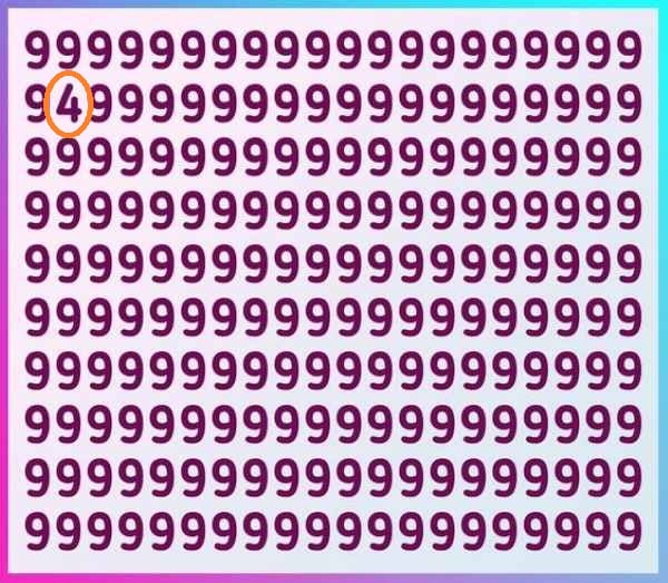 In der nächsten optischen Täuschung müssen Sie die Zahl 4 unter einer großen Anzahl von Neunen finden, schreibt jagranjosh. Es wird nicht einfach sein, zu verstehen, wo genau sich die verlorene Ziffer befindet.
