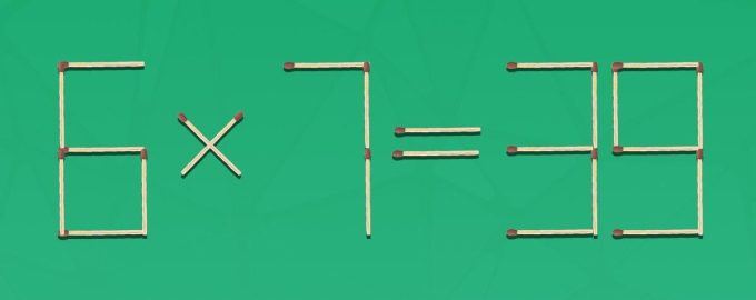 Vor Ihnen liegt eine falsche mathematische Gleichung 6 × 7 = 39, die sich aus 24 Streichhölzern zusammensetzt. Die Aufgabe besteht darin, nur zwei Übereinstimmungen zu entfernen und das Beispiel in ein richtiges zu verwandeln, bei dem 22 Übereinstimmungen übrig bleiben.