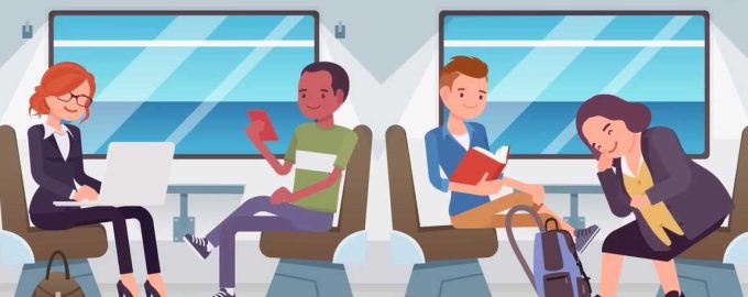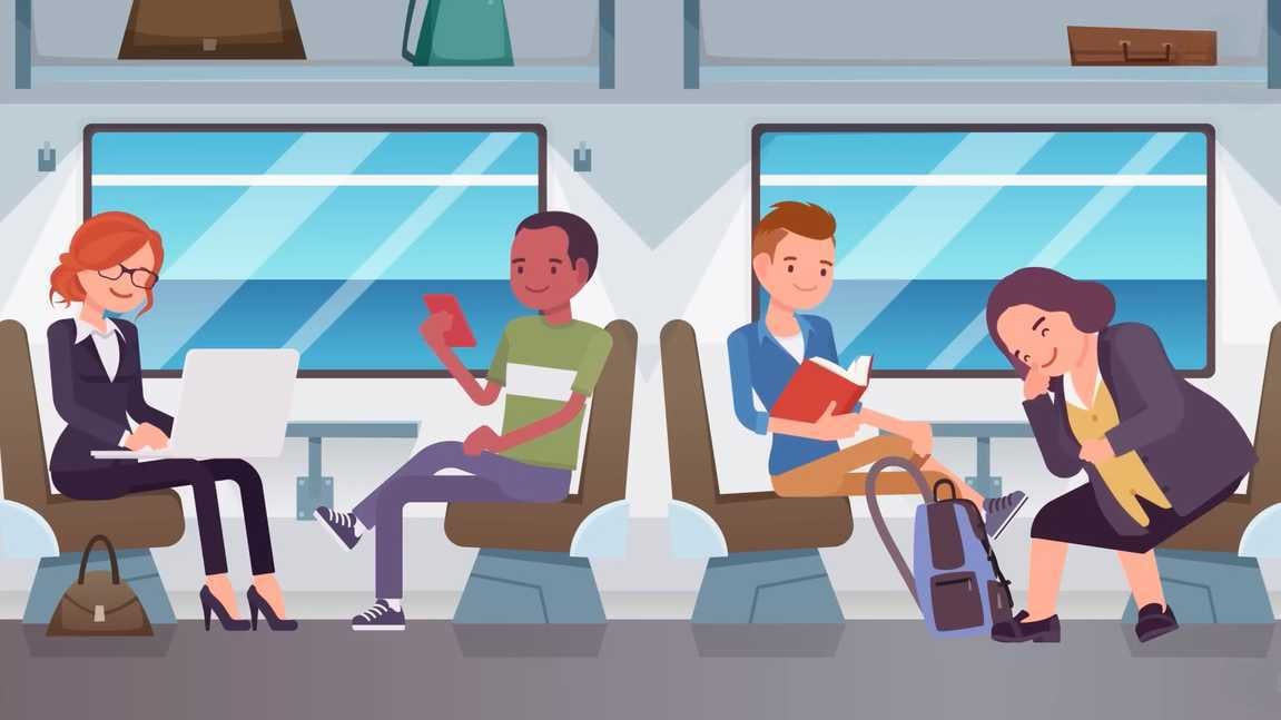 Das Bild zeigt vier Personen in einem Zug, von denen jede etwas anderes tut.