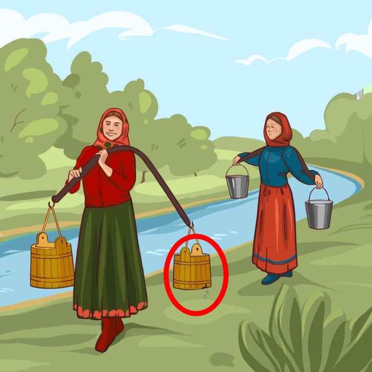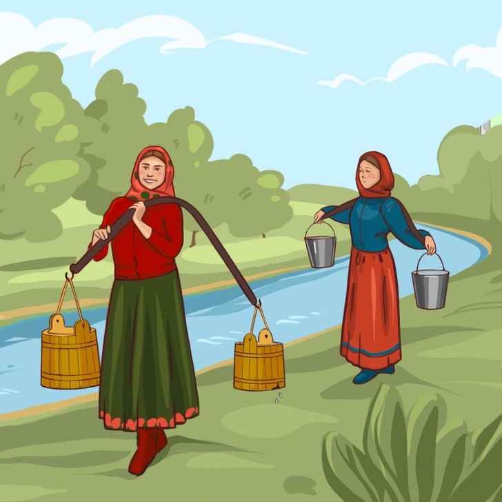 Auf dem Bild sehen wir zwei Frauen, die jeweils zwei Eimer Wasser in einem Eimer tragen. Aber die Eimer der beiden Frauen sind nicht gleich, so dass jede von ihnen eine andere Menge Wasser mit nach Hause bringen kann. Wir müssen raten, wer am Ende die kleinere Wassermenge hat.