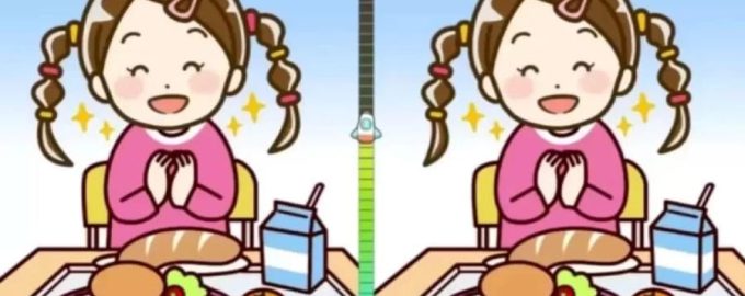 Diese beiden Bilder zeigen ein Qtinamädchen am Esstisch. Auf den ersten Blick sind die beiden Bilder identisch, aber es gibt drei nicht offensichtliche Unterschiede zwischen ihnen. Versuchen Sie, sie zu finden.