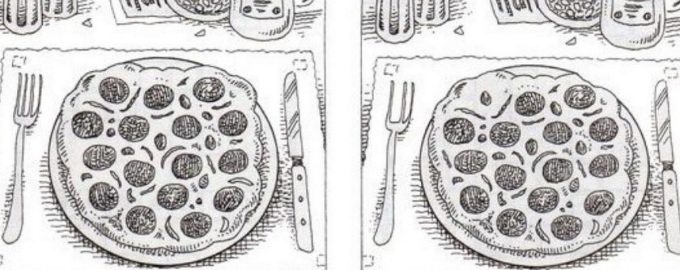 Eine neue optische Täuschung aus der Ressource printablee.com wird von Mirror angeboten. Das Bild zeigt einen zum Abendessen gedeckten Tisch mit einem Teller, auf dem eine appetitliche Peperoni-Pizza liegt. Ihre Aufgabe ist es, alle Unterschiede zwischen den Bildern in 20 Sekunden zu finden. Es gibt 8 Unterschiede, also seien Sie sehr aufmerksam.