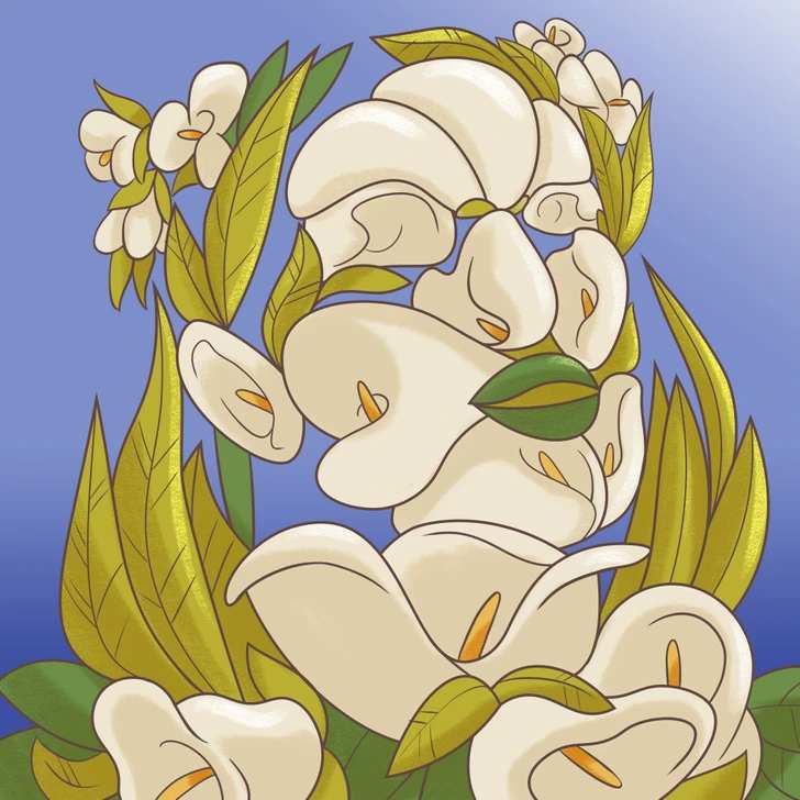 Das Mädchen ist auf dem Bild schwer zu erkennen, weil ihr Gesicht von Blumen verdeckt wird und statt der Lippen zwei grüne Blätter zu sehen sind.