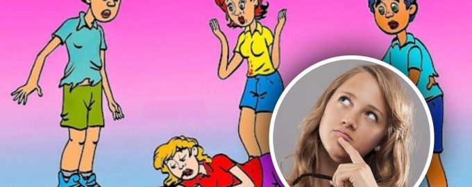 Auf dem Bild sehen wir drei Personen, die sich über die Leiche eines toten Mädchens beugen. Es scheint, dass alle Personen auf dem Bild, einschließlich der Verstorbenen, Freunde waren, die zusammen Rollerblades fuhren. Und einer der Freunde ist für den Tod des Mädchens verantwortlich, das auf dem Boden liegt.