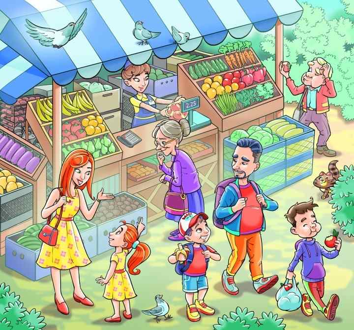 Das Bild zeigt einen Lebensmittelmarkt, zu dem viele Menschen gekommen sind, um Lebensmittel zu kaufen. Wir sehen einen Vater und seine beiden Söhne, die den Markt verlassen, nachdem sie alles eingekauft haben, was sie brauchen; eine Mutter, die sich mit ihrer Tochter unterhält, die auch etwas kaufen möchte und ihrer Mutter davon erzählt; eine Großmutter, die an der Theke Gemüse auswählt; einen Großvater, der interessiert eine rote Paprika betrachtet, die er in der Hand hält.
